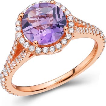 A romantic rose gold plated sterling silver ring features a round-cut amethyst with a simulated diamond halo on a pave split shank ring for beautiful sparkle.