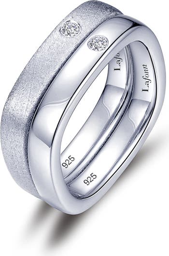 Perfect to stack or wear solo, this elegant ring set showcases round simulated diamonds inset within brushed and polished bands.