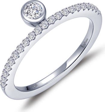 A bezel-set simulated diamond sparkles atop a row of smaller simulated diamonds on this elegant and modern half-eternity band.