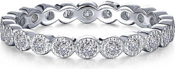 Round simulated diamonds sparkle within milgrain-textured settings on this elegant eternity ring crafted from platinum-bonded sterling silver.