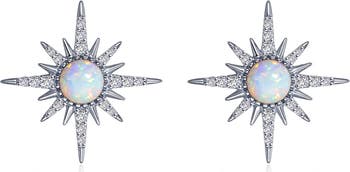 Polished cabochons of simulated opal or turquoise gleam at the center of these sunburst stud earrings framed with sparkling simulated diamonds.
