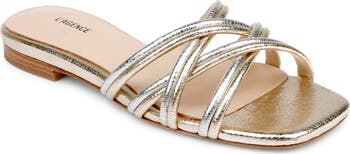 Slender straps crisscross over the vamp of a versatile slide sandal fashioned with a squared-off toe for contemporary appeal.
