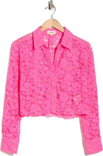 Make a stunningly romantic statement in this sheer button-front shirt fashioned from airy floral lace.
