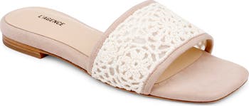 Crocheted detailing lends textural intrigue to the vamp of a slide sandal fashioned with a squared-off toe for contemporary appeal.