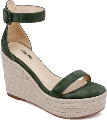 A jute-wrapped platform and integrated wedge heel lend espadrille-inspired styling to a weekend-ready sandal secured with an adjustable strap at the ankle.