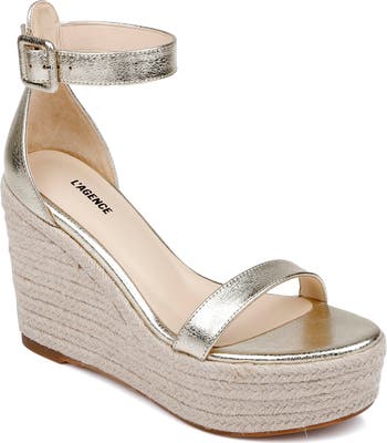 A jute-wrapped platform and integrated wedge heel lend espadrille-inspired styling to a weekend-ready sandal secured with an adjustable strap at the ankle.