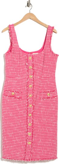 Build out your work-to-weekend collection with a tweedy dress polished with brassy buttons and cut to a leg-baring length.
