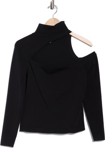 Asymmetric cutouts bring instant night-out appeal to this long-sleeve turtleneck top cut from an ultrasoft and stretchy knit.