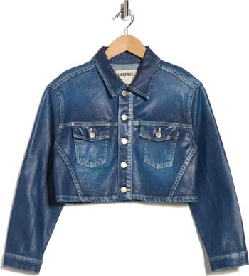 Layer on this playfully cropped trucker jacket cut from faded cotton-blend denim with a coated finish.