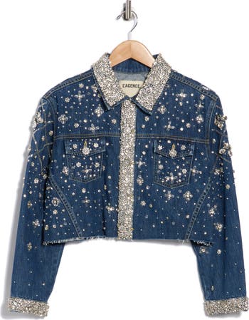 Sparkle all day in this glamorous cropped denim jacket bedazzled with icy crystals, glistening beads and shimmering sequins.