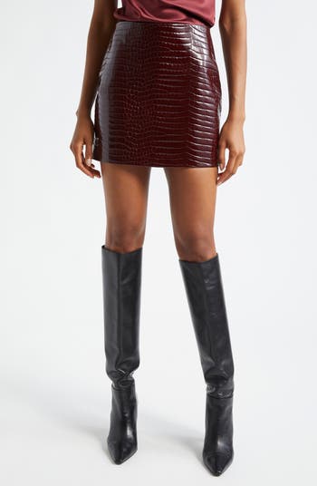 Shiny faux-leather with crocodile embossing brings an edgy vibe to this bold miniskirt that has smooth seams for a tailored fit.