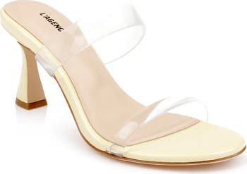 Translucent vamp straps amplify the trend-savvy appeal of a minimalist slide sandal set on a cushioned footbed and tapered flare heel.