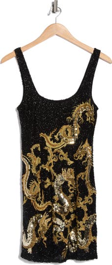 Shimmering sequins and beads illuminate swirling dragons on this striking cocktail minidress cut in a figure-skimming silhouette.