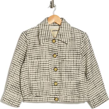 Designed to be worn as a top or layering piece, this windowpane-textured tweed jacket features three-quarter sleeves and gleaming buttons for polished style.