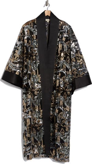 Shimmering, mixed-metallic sequins amp up the appeal of a graceful, semi-sheer ruana designed with glossy satin hems.