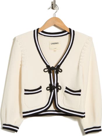 A modern take on the classic cardigan, this cotton-blend cropped knit stands out with contrasting trim and sculptural frog-knot closures. Subtle shoulder pads give the silhouette structure, while three-quarter sleeves and patch pockets add everyday ease.