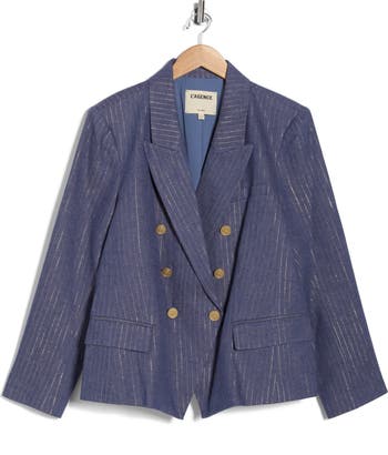 Traditionally polished pinstripes get a light-catching metallic upgrade with this boxy, oversized blazer cut from a fresh linen blend kissed with cotton.