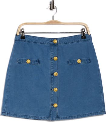 Goldtone crest buttons bring refined polish to this denim miniskirt perfect for elevating your off-duty 'fits.