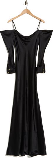 Cold-shoulder sleeves add a touch of romance to an ankle-grazing dress cut from pure silk for an elegant look and feel.