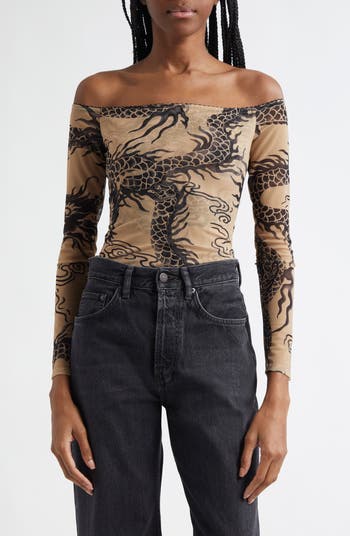 A tattoo-inspired dragon print brings day-to-night edge to this layered-mesh bodysuit that's left sheer at the sleeves to amplify the freshly inked look.