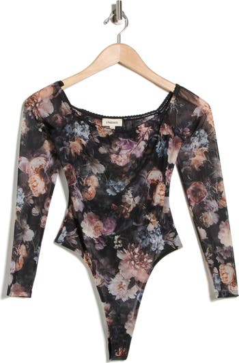 An off-the-shoulder neckline and blossoming floral print distinguish a figure-hugging bodysuit crafted from breathable mesh.
