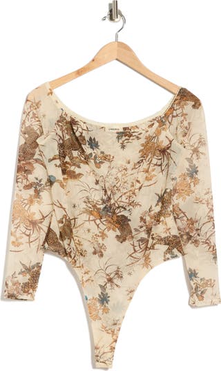 A shoulder‑baring neckline elevates the posh styling of this long‑sleeve bodysuit patterned in a jungle print.