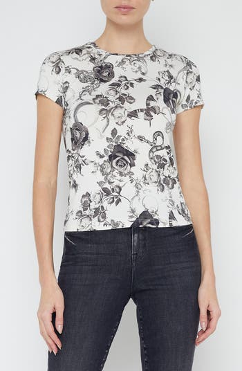 A baroque-inspired pattern makes a bold statement on a fitted T-shirt complete with a classic crewneck.