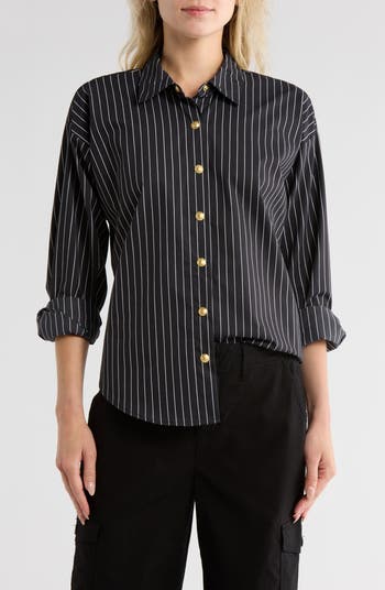 Classic pinstripes run down a button-up shirt framed with a spread collar and long sleeves.