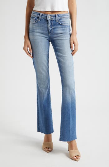 Heavy whiskering perfects the look of kicky jeans that have raw hems for modern edge.