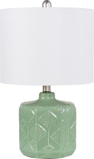 An embosses base and fabric lampshade pair perfectly in this modern table lamp that gives off a warm, beautiful light.