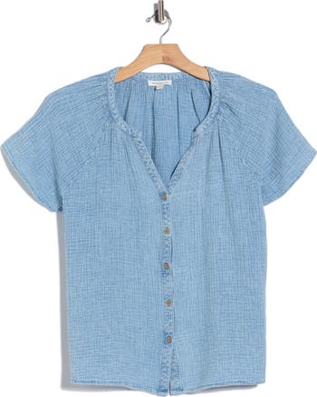 Shirring shapes the swingy silhouette of a summery shirt cut from airy cotton gauze.