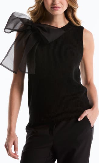 This sophisticated sweater-vest features a flattering, fitted silhouette and a bold organza bow cascading off one shoulder.