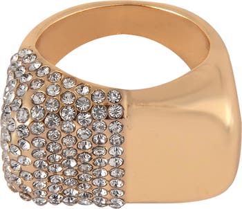 Shimmering pavé crystals cover half of the flat-top cocktail ring made from warm goldtone plate.