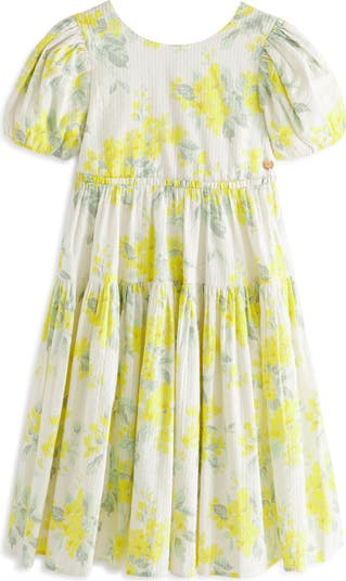 An apple-blossom print from the Laura Ashley archives brings cheery color to this cotton seersucker dress featuring puff sleeves and a full skirt.