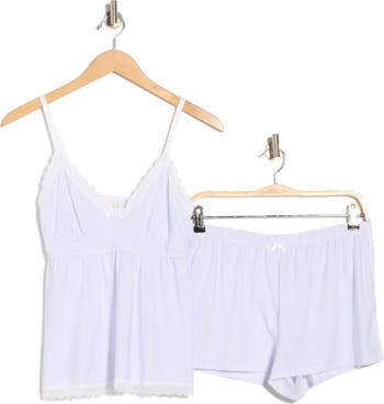 Perfect for snoozing or Saturday-morning scrolling, this pajama set pairs a cute lace-trimmed camisole with matching shorts.