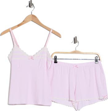 Stay cozy and comfy all night long in this fetching two-piece stretch-knit pajama set featuring a strappy, bow-trimmed camisole and minishorts with scalloped lace hems.