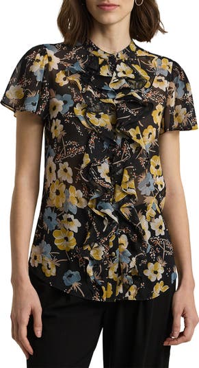 Frilly ruffles cascade along the button placket of this crinkly, airy shirt covered in romantic blooms.