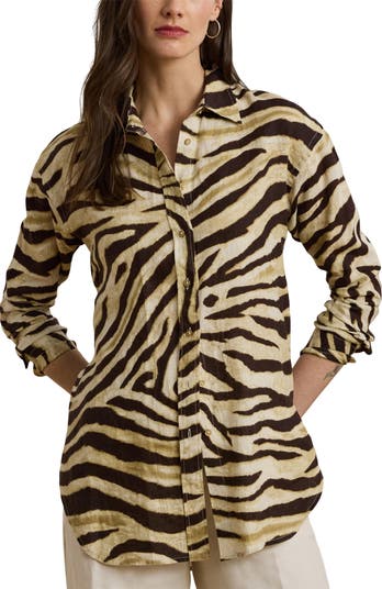 Featherweight linen will feel like wearing nothing at all in this cool and breathable button-up shirt cut in a relaxed fit and covered in fierce zebra stripes.