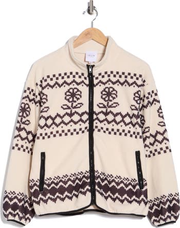 A charming print lends visual interest to a zipped jacket crafted from supersoft fleece to bring warmth and easygoing comfort to casual looks.