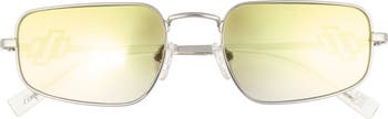 Mirrored polycarbonate lenses enhance the futuristic style of these sleek rectangular sunglasses made with recycled-metal frames.