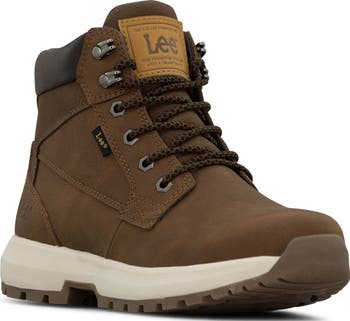 A denim and faux-leather upper grounded on a lugged sole bring rugged sophistication to a lace-up boot finished with a padded collar and insole for comfort.