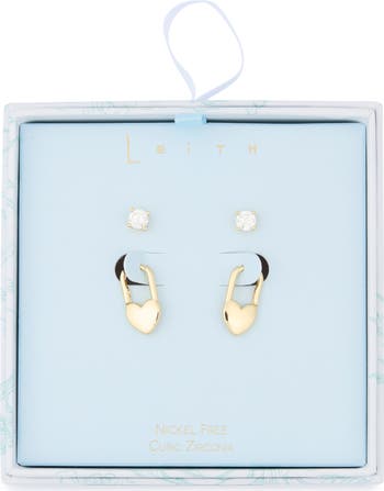 This set of two earring pairs includes classic cubic zirconia studs and a chic heart lock design for mix‑and‑match styling.