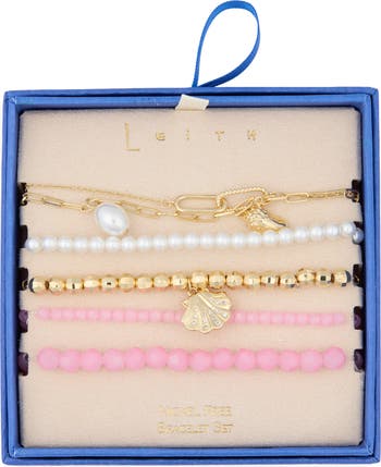 This set of five bracelets features a mix of beaded styles accented with cubic zirconia and faux pearls, with one bracelet finished with a charming shell detail for added interest.