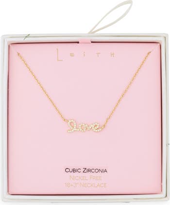 Pavé cubic zirconia stones illuminate the elegant script of a dainty goldtone pendant suspended from a polished chain that adjusts for versatile wear.