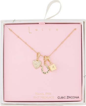 A trio of charms—a heart, horse shoe and a die—sparkle in cubic zirconia pavé on this goldtone necklace.