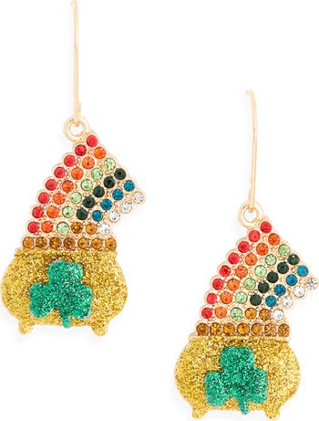 Put whimsical finishing touch on any ensemble with these St. Paddy's Day-inspired drop earrings in a crystal-embellished rainbow silhouette.
