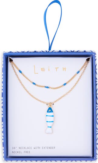 Love to layer with this set of necklaces including an enamel-dotted station chain and an enamel fish pendant.