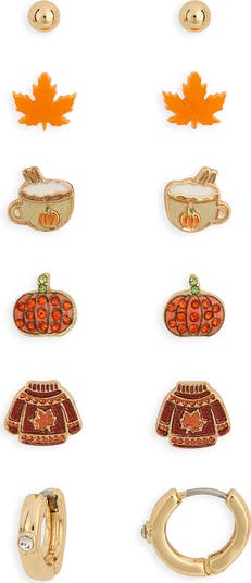 Put whimsical finishing touch on any ensemble with this harvest-inspired set of assorted stud earrings detailed with leaves, pumpkins and more.