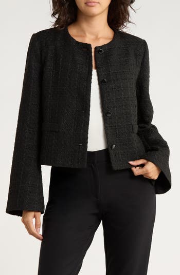 Bring sophisticated style to your workday with this textural tweed jacket fashioned in a cropped silhouette.