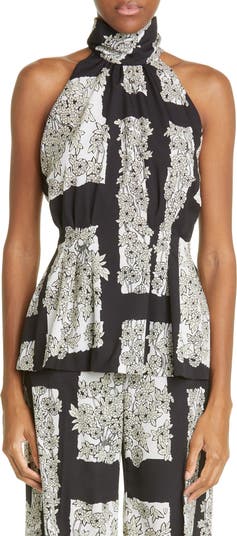 This smooth crepe blouse is designed in a flowery print with a high neckline and sleek cutaway shoulders.